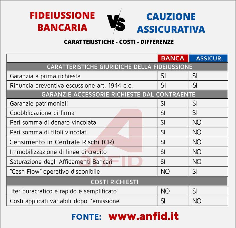Quando è una banca ad emettere la garanzia, è prassi richiedere il congelamento di beni, titoli o somme di denaro, per questo la fideiussione emessa da una compagnia di assicurazione è più veloce rispetto alla fideiussione emessa dalla banca in quanto l’iter burocratico non prevede alcun immobilismo dei beni, condizione spesso d’intralcio alle operazioni di crescita degli imprenditori. La differenza tra i due tipi di fideiussioni è rilevante sia in termini di costo sia relativamente alle tempistiche burocratiche.